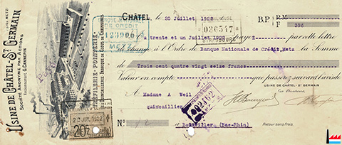 | 1922 | ![]() Facture de l'Usine de Châtel-St-Germain, près Metz S.A. - 30.6.1922 (Collection: industrie.lu) ![]() Lettre de change de l'Usine de Châtel-St-Germain, près Metz S.A. - 20.7.1922 (Collection: industrie.lu) |