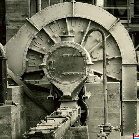 Société Belge d'Electrochimie, Langerbrugge: Tube broyeur triplex TC120 x 6 m ARBED Dommeldange 1929 - côté sortie du carbure broyé avec répartition dans les silos par vis transporteuse (Photo collection: industrie.lu)