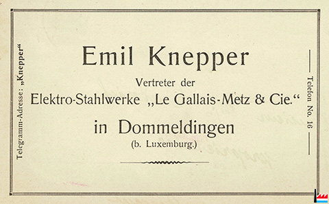 | <=1917 | Emil Knepper - Thiry, Esch Vertreter der Dommeldinger Elektrostahlwerke, Brasseur & Wagener |