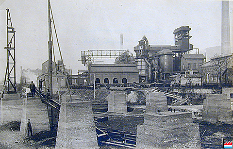 1908: Les fondations: La première colonne montée (Photo: ARBED Dommeldange)