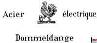 ![]() Marque de fabrique N° 1620 - 29 avril 1908. - Le Gallais Metz & Cie à Dommeldange. - La marque représente un coq poussant de la patte droite un oeuf, entouré de l'inscription : « Acier électrique Dommeldange » . Elle est apposée sur des produits d'acier fondu, des barres, des lingots, etc., en un mot sur toutes les pièces en acier que produit l'usine de la société susdite |