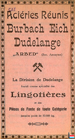 | 30.10.1911 | Constitution de la société ARBED (Aciéries réunies de Burbach-Eich-Dudelange) suite à la fusion de: |