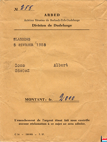 Paitut Arbed Dudelange - Slabbing - 5.2.1958 - Loos Albert, Montant: 2000 fr