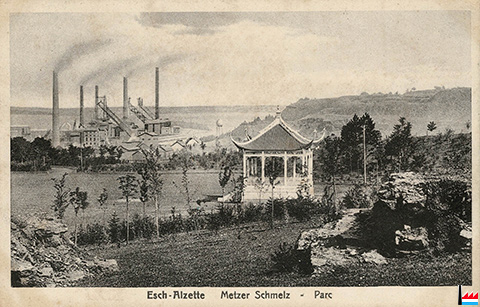 Esch/Alzette - Metze Schmelz - Parc avec pavillon chinois (Carte postale: Papiers en gros P. Houstraas, Luxembourg-Gare, Nr 19; collection: industrie.lu)