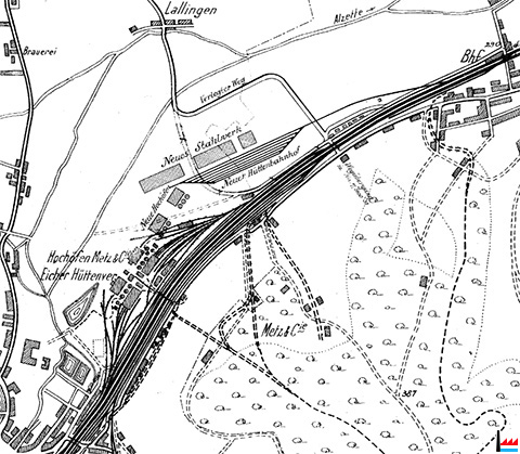![]() Hochöfen Metz & Cie - Eicher Hüttenverein, Esch - Schifflingen (Übersichtskarte des Erzgebietes bei Deutsch-Oth, Esch und Villerupt - Kaiserliche Eisenbahn-Generaldirektion, Strassburg - 2.1910) Neue Hochöfen, neues Stahlwerk - neuer Hüttenbahnhof - verlegter Weg Lallingen - Schifflingen |