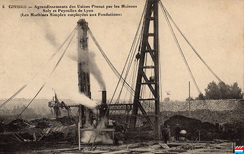 Givors - Agrandissements des Usines Prénat par les Maisons Soly et Peyrolles, Lyon - Les machines Simplex employées aux fondations - vers 2.1914 (Carte postale: Collection: industrie.lu)
