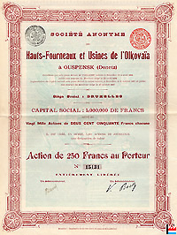 | 7.1907 | Révolution russe: Les actions des Hauts Fourneaux de Halanzy perdent encore plusieurs points à 1187,50. On sait que cette entreprise est intéressée dans la Société des Hauts Fourneaux et Usines de l'Olkovaïa, puisqu'elle a conservé les actions de jouissance qu'elle a reçues à sa fondation, pour son concours technique. (Le Capitaliste N° 30 - 25 JUILLET 1907) |