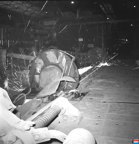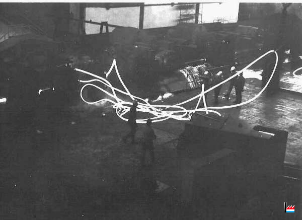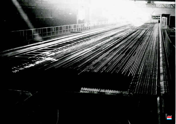 | 4.11.1969 | Nouveau four poussant OFU pour chauffer des billettes de 80 x 80 à 100 x 100 mm, capacité 100 t/h, longueur 9,1 m. Utilisation du gaz naturel pour la première fois à l’usine. Ajout de 4 cages SCHLOEMANN supplémentaires au dégrossi. (17 cages duo dont 4 dégrossisseurs de 450 mm de diamètre et 13 cages de 16" et 14" Remplacement des moteurs électriques, nouveau refroidissoir SCHLOEMANN pour ronds, longueur 85 m, mise en service d’un bottelage semi-automatique DEMAG au magasin. |