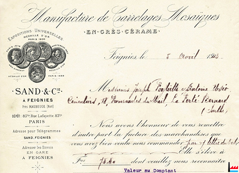 | <=1913 | ![]() Manufacture de Carrelages Mosaïques Sand et Cie à Feignies - Facture du 5.4.1913 (Collection: industrie.lu) |