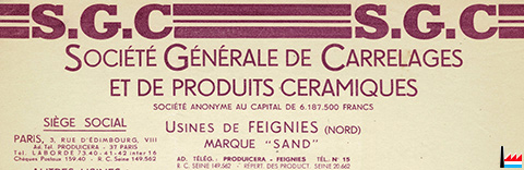 | <=1939 | ![]() S.G.C. - Société Générale de Carrelages et de Produits Céramiques, Usines de Feignies (Nord), tél: 15, marque "Sand" - 12.1939 (Collection: industrie.lu) |