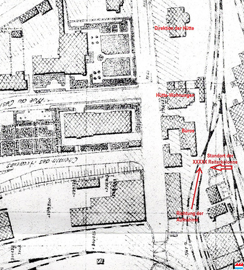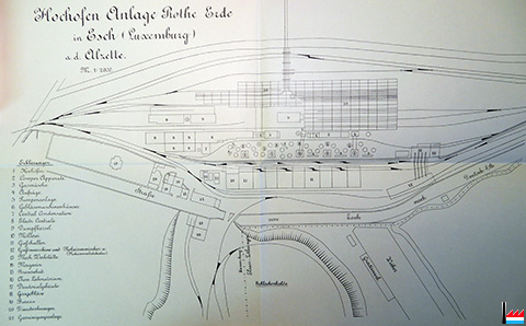 Die 3 Escher Werke (Belval, Terre-Rouge, Esch-Schifflange) sind durch Gasleitungen miteinander verbunden, hier in Terre-Rouge? (Aus: Daten aus der Luxemburgischen Eisenindustrie, n° IX. - Zusammengestellt von Camille Aschman, A-Z, 1935 - Collection famille Aschman-Bodson)
