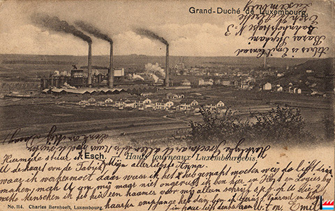 ![]() Gelsenkirchener Hütte in Esch/Alzette / Luxemburg (Carte postale: Manufacture de cartes P. Houstraas, Luxembourg, Nr 3?7; collection: industrie.lu) |