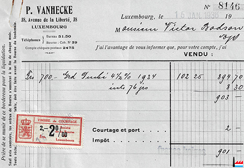 P. Vanhecke Agent de change agréé Bruxelles, Paris, Anvers LUXEMBOURG Téléphone 5150 recommande ses services pour : ORDRES DE BOURSE sur toutes les places au comptant et à terme. Souscription à toutes émissions publiques, Encaissement de coupons et de titres remboursables, Garde de titres, Gestion de portefeuilles, Ouverture de compte à vue et à terme, Renseignements financiers, etc. (LW : 20.4.1929) |