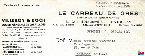 Villeroy & Boch - Feignies - facture du 16.3.1962 (Collection: industrie.lu) |