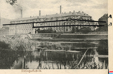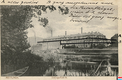 | 13.8.1921 | ![]() Steingutfabrik Mettlach (Postkarte: Verlag von Eduard Beck, Buchdruckerei, Mettlach. L. 12250; Collection: industrie.lu) A: Alles zerstört B: ganz ausgebrannt, auch die Seitenflügel; mein d.h. unser Büro ist ganz ausgebrannt |