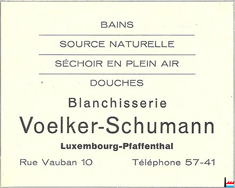 | Juin 1950 | 56 29 Voelker - Klein, Nicolas, r. de Neudorf, 17/19 57 41 Voelker - Schumann, Othon, Vve, blanchisserie, bains et douches, r. Vauban, 10 35 18 Hames - Voelker, blanchisserie, rue Vauban, 24. Indicateur officiel des téléphones, page 222 - juin 1950 - Imprimerie St. Paul. Luxembourg (Collection Philippe Aschman). |