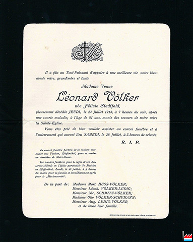 Faire-part du décès de Madame Veuve Léonard Völker, née Félicie Stadtfeld, le 24 juillet 1913.