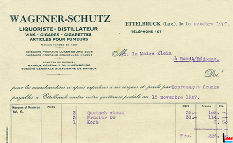 ![]() Liquoriste - Distillateur Wagener - Schutz, Ettelbruck - 1927 (Scan: Romain Gaspar) |