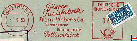 | 11.9.1953 | ![]() Trierer Tuchfabrik, Franz Weber & Co, Trier - 1953 (Collection industrie.lu) Deutsche Bundespost 20 Pfennig + Steuermarke Notopfer Berlin 2 Pfennig |