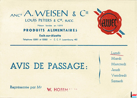 ![]() AWEC - Anct A. Weisen & Cie, Louis Peters & Cie - Avis de passage pour l'Epicerie Hilbert-Roben, Schifflange, 26 rue de l'Usine - 3.8.1961 (Collection: industrie.lu) Représentée par: W. Hoffmann |