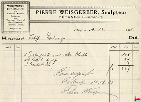 | <=12.1925 | ![]() Weisgerber Pierre, Pétange, sculpteur, tél: 37 - 12.1925 (Collection industrie.lu) Monuments funéraires en marbre, granite, syénite Travaux d'art et d'architecture, sculptures, gravures |