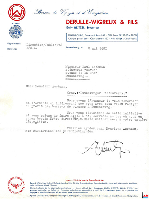 | 1.4.1927 | Reprise du Bureau de voyages Derulle-Wigreux et fils par Joseph Weitzel - Kammes, fondé de pouvoir à la Société Alsacienne de Banque, Luxembourg |