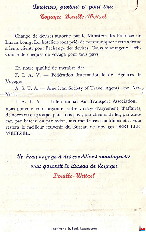 | 1953 | ![]() Bureau de voyages Emile Weitzel, Luxembourg (Dans: Luxemburger Marienkalender 1953; Scan: Philippe Aschman) |