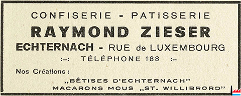 ![]() Raymond Zieser - 1935 Confiserie - Pâtisserie 9 rue de Luxembourg, Echternach Tél: 188 Nos créations: Bêtises d'Echternach Macarons mous "St. Willibrord" |