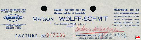 | <=1957 | ![]() Wolff-Schmit, Ettelbruck-Gare - Magasins de machines agricoles et industrielles Succ. Cames & Wiser s.àr.l. (Collection: industrie.lu) Tracteurs agricoles Deutz Machines de récolte: Bamford, Hummel, Eberhardt, Fella |