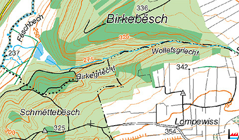 ![]() Wollefsgriecht, riets vun der Birkegriecht, Keispelt - Ansemburg - 1954 © Origine Administration du Cadastre et de la Topographie Luxembourg (ACT) - Extrait de la carte topographique à l'échelle 1: 25.000 édition 1954 et de la carte topographique récente à l'échelle 1: 50.000 - Autorisation de publication du 20.10.2010.» |