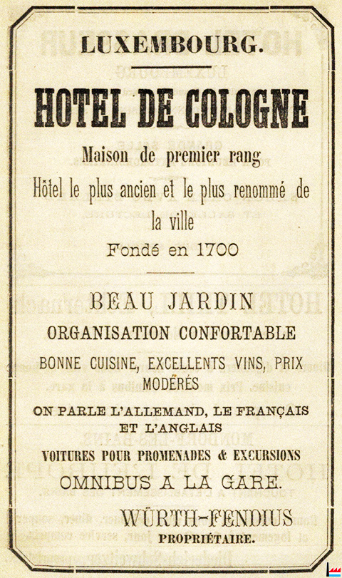 | 1885 | ![]() HOTEL DE COLOGNE Hôtel le plus ancien et le plus renommé de la ville Fondé en 1700 Würth-Fendius, propriétaire. (Le Luxembourg pittoresque. - Guide du tourisme. - Esquisse par M.-A. Perk, - 1885 – Imprimerie L. Schamburger. - Collection B.N.L.) |