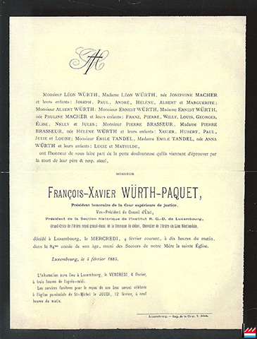 Faire-part du décès de François-Xavier Würth-Paquet le 4 février 1885. - Reproduction éditée à l'occasion du dévoilement le 13 juin 2002 de la plaque commémorative "François-Xavier Würth-Paquet" placée sur la façade de la maison Wurth-Paquet sise au n° 4, rue Sigefroi, Marché-aux-Poissons.