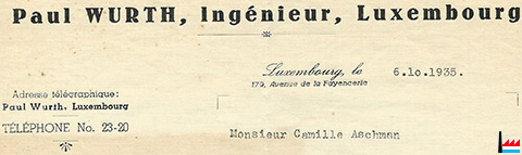 6.10.1935 - Paul Wurth, Ingénieur, Luxembourg, 179, avenue de la Fayencerie, Limpertsberg - Papier à lettre à entête - Archives Camille Aschman Jr. - Collection famille Aschman-Bodson.