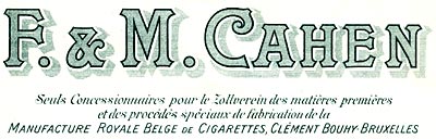 ![]() F. et M. Cahen Seuls Concessionnaires pour le Zollverein des matières premières et des procédés spéciaux de fabrication de la Manufacture Royale Belge de Cigarettes, Clément Bouhy - Bruxelles |