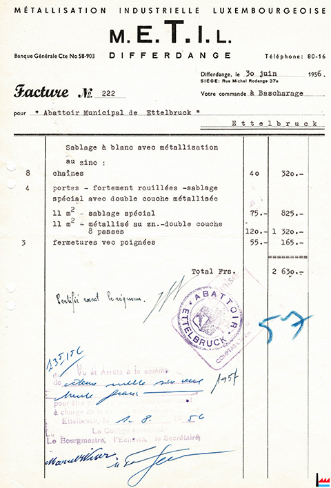 Facture M.E.T.I.L. pour Abattoir Municipal d'Ettelbruck - 30.6.1956 (Collection: industrie.lu)