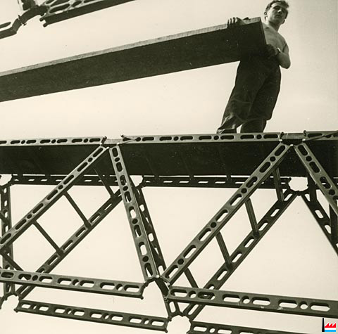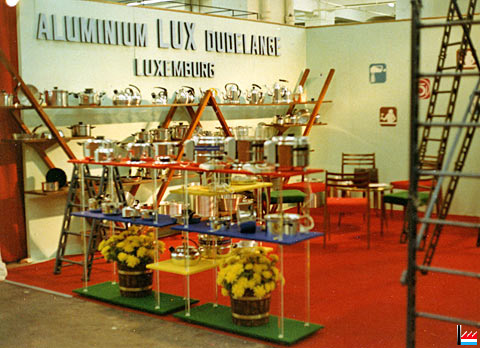 échelles pliables et transformables (en acier COROX, provenant des laminoirs d'ARBED-Dudelange) et en aluminum (alliage breveté par Aluminum LUX et produit par un laminoir italien) invention de M. Capgras |