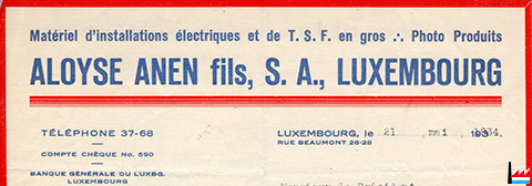 Matériel d'installations électriques et de TSF en gros - photo produits Aloyse ANEN fils, S.A., Luxembourg - 1934 (Collection: industrie.lu)