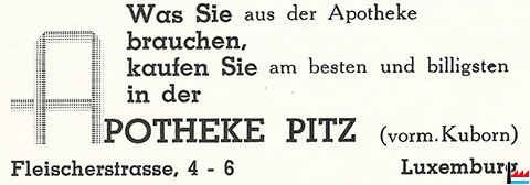 1936 - Apotheke Pitz vorm. Kuborn - Fleischerstrasse, 4-6, Luxemburg - (2e exposition nationale des métiers - Dimanche, 7 juin 1936 - Union-Fanfare, Bertrange - 25e anniversaire; Collection Charles-Louis Aschman)