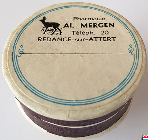 Pharmacie Al. MERGEN - Téléph. 20 - REDANGE-sur-ATTERT. - Boîte ronde en carton de 4,6 cm de diamètre et de 2 cm de hauteur (Collection Philippe Aschman)