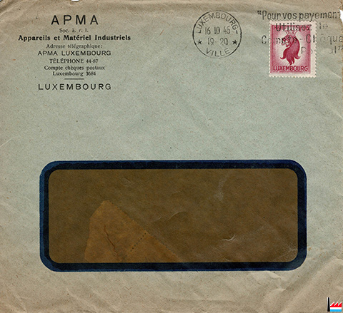 | 1945 | ![]() APMA sàrl, Appareils et Matériels Industriels, Luxembourg - 16.10.1945 (Collection: industrie.lu) |