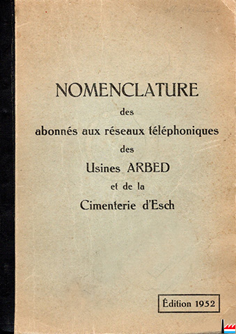 | 1952 | ![]() Nomenclature des abonnés aux réseaux téléphoniques des Usines ARBED et de la Cimenterie d'Esch (1952; Collection: Marcel Schlim) Telefonbuch 1952 mit den Werken AES - AEB - TERRE-ROUGE - MINES - CIMENTERIE und (ADU nur Telefonzentrale - Nummer) |