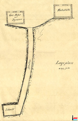 | 19.1.1906 | Au siège de l'exploitation est construit un peitit atelier de fendeurs d'ardoise, en schiste ardoisier et couvert de carton. A l'intérieur se trouvent 2 machines à main, pour couper les ardoises. A flanc de coteau s'élève un petit bâtiment de schiste ardoisier et couvert de carton qui sert à l'abri des ouvriers, pour manger la soupe, etc. Un autre édifice en planches dit "Maschinenhaus" renferme une petite forge, en outre il y est installé un moteur à benzine de 6,5 cv qui fait marcher un dynamo de 7 C.V. A côté de ce bâtiment entre une galerie de 1,8 m largeur et 2 m hauteur, qui aboutit après 45 m de longueur à un puits d'extraction. Ce puits a une profondeur de 30 m. Sur ce dernier niveau on a commencé 3 chambres. Une voie ferrée de 40 cm d'écartement, installée dans ces travaux, sert au transport des matériaux. Les travaux ont été inondés au mois de décembre 1905. |