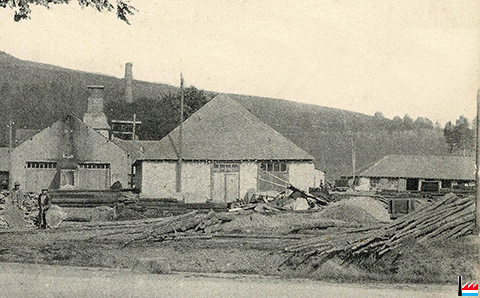 Atelier de fendeurs d'ardoise des Ardoisières - Schieferspaltwerkstatt der Schiefergrube L. Donner & Cie, à Martelange-Rombach (Luxembourg), avec embranchement à la ligne cantonale de Noerdange à Martelange (Collection: industrie.lu)