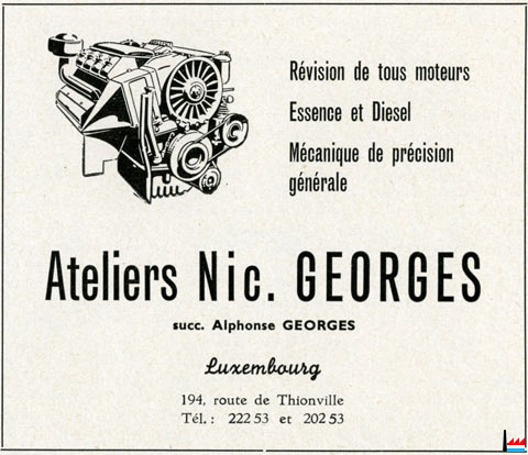 | octobre 1955 | Fondation: ATELIERS NIC. GEORGES, 194, route de Thionville à Luxembourg (Bonnevoie) Alphonse Georges, fils de Nic. Georges |