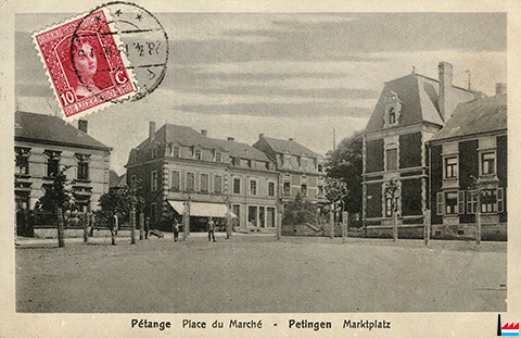 Pétange - place du Marché: à la droite: la maison de la direction des Mines de l'Usine d'Athus - Markthausplatz in Petingen, rechts: Grubendirektionshaus der Athuser Hütte - <=1919 (Carte postale: Photographie Jacquemin Eugène, Pétange; Collection: industrie.lu)