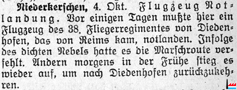 | 16.7.1918 | Bonneweg, 18. Juli 1918. Dienstag Nachmittag landete in einem Kartoffelfeld in der Nähe des Howalds ein deutscher Doppeldecker, der nach zweistündigem Aufenthalte weiterflog. (OMZ: 19.7.1918) | |||||||