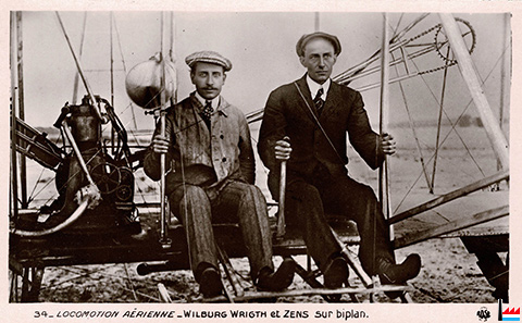| 16.9.1908 | ![]() Ernest Zens (à gauche, comme passager) et Wilbur Wright (à droite, comme pilote) sur biplan au Camp d'Auvours à Le Mans - 16.9.1908 (Carte postale: Marque ROSE, Paris, 145 rue du Temple; Collection: industrie.lu) |