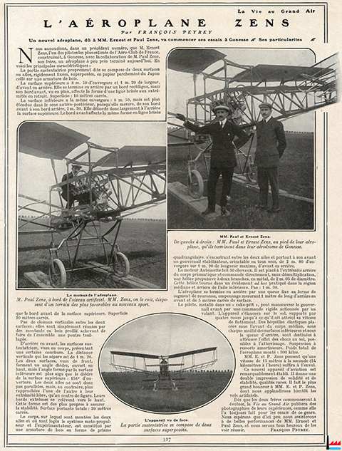 | 9.1908 | Paul Zens et Ernest Zens, les deux plus jeunes fils de notre compatriote l’ancien directeur, aujourd’hui président du Conseil d’administration des chemins de fer départementaux comme ingénieurs au service de Wilbur Wright. C’est en qualité de sportsmen enthousiastes de la locomotion nouvelle qu’ils sont allés s’installer au Mans pour suivre de près les expériences de l’aéroplane Wright. ... (LIL: 26.9.1908) |