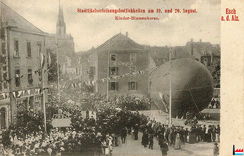 | 19-20.8.1906 | ![]() Esch/Alzette - Stadttitelverleihungsfestlichkeiten - Kinder-Blumenkorso, Esch/Alzette, Norbert Metz-Platz (Carte postale: Vogt's Verlag, Esch - 113969; Collection: industrie.lu) Grand Bazar - Hôtel Klop - Gasballon |