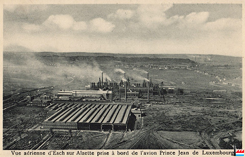 Usine Terre Rouge, Esch/Alzette - vue aérienne prise à bord de l'avion Prince Jean de Luxembourg - 193x (Carte postale: Aviat. L. Hemmer - Photo et Phototypie Schaar & Dathe A.G. Trier, Luxembourg; Collection: Marcel Schlim)